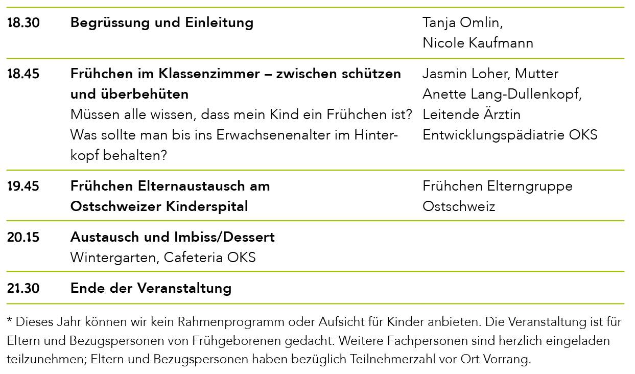 Dieses Jahr haben wir zum Welt-Frühgeborenen-Tag einen Elternabend mit ca. 70 Teilnehmer/Innen organisieren können. Seit Anfang Jahr findet monatlich ein Elternaustausch von Eltern für Eltern von frühgeborenen Kinder statt. J. Loher, Y. del Rosario und S. Schreck haben Ihre Erfahrungen als Mütter von Frühgeborenen geschildert und wie sie den Austausch am Ostschweizer Kinderspital, auch in Zusammenarbeit mit Frühchen Schweiz, am Aufbauen sind (siehe auch Eltern-Vereinigung auf dieser Seite).